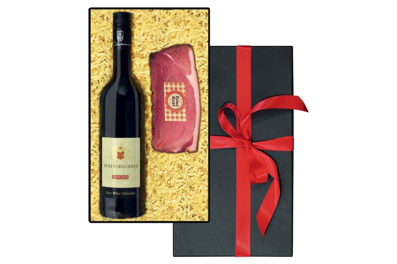 1 Flasche Spätburgunder Rotwein trocken. Sehr charmant und beschwingt, mit milder, weicher und einschmeichelnder Frucht, 0,75 l. 1 Feine-Kost Schinken, ca. 200 g.