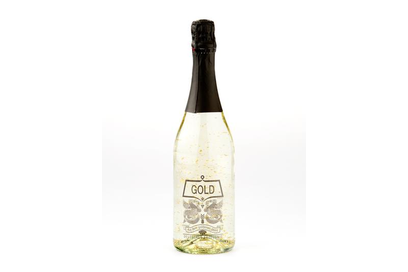 Eine Flasche Gold Cuvée, mit 22-Karat Blattgold im Mousseux in Klarsichtgeschenkverpackung.