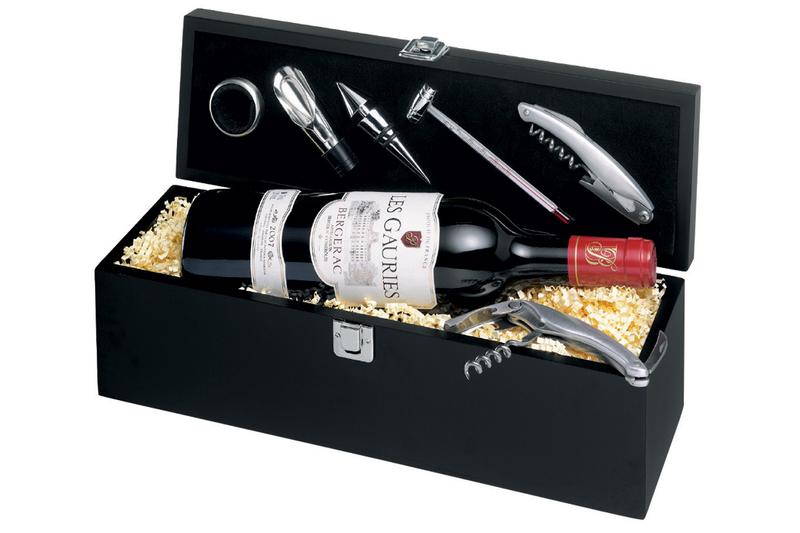 1 exklusives 5-teiliges Weinset 1 Sommelier-Korkenheber, 1 Weinthermometer, 1 Ausgießer, 1 Flaschenverschluss und 1 Tropfenfänger. 1 Flasche hochwertiger Les Gauries, Bergerac Ein faszinierend fein-fruchtiger Wein, samtig mit feinen und reifen Tanninen, 0,75 l.